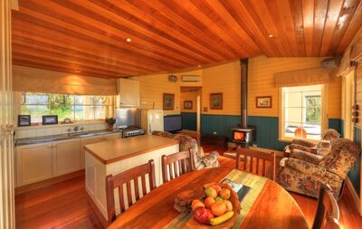 Arguably one of the best positioned self contained cottages in the state! A very secluded single cottage nestled amongst 5.5 acres of Tassie bush only 150m from the waters edge. Featuring a huge north facing outdoor living area with commanding 180 degree views out over Duck Bay, Bass Strait, Perkins, Robbins and Three Hummock Islands. The cottage is a replica Federation home, with homely log fires, polished timber floors and ceilings and tastefully furnished with antique furniture. It is fully self contained, complete with kitchen and laundry facilities and has two bedrooms - one with ensuite complete with a separate shower, cast iron bath and polished tassie myrtle floors. Tasmanian oak ceilings feature throughout. There are two wood fires, one in the lounge room and another out through the French doors on the expansive verandah facing a large oval two person spa. The cottage has 4 beds and can sleep a maximum 5 people.
