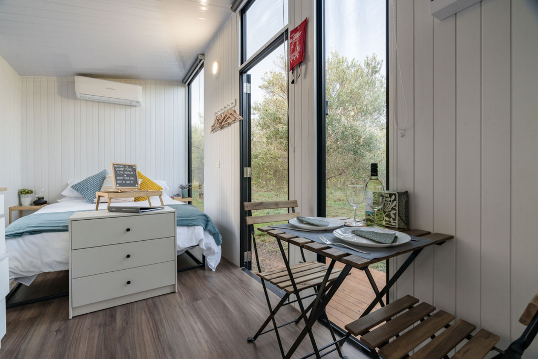 Olive Grove Retreat 1 by Tiny Away is located in the small town of Lake Boga, where you can partake in captivating craft classes, and farm tours and bond with our friendly farm animals. A snug tiny homelocated just 15 minutes away from Swan Hill, a town famous for its stone fruits, wineries, and the annual Swan Hill Food and Wine Festival which takes place on Labour Day's Long Weekend in March.