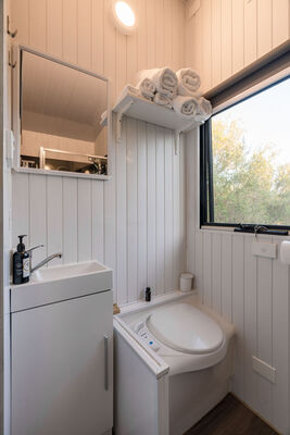 It's a 139-square-foot tiny home with easy access to water, split air conditioning, a kitchenette, cooking equipment, and excellent bathroom facilities. This includes a cassette toilet with a removable waste-holding tank, hand basin, and shower (gas-heated for hot showers).