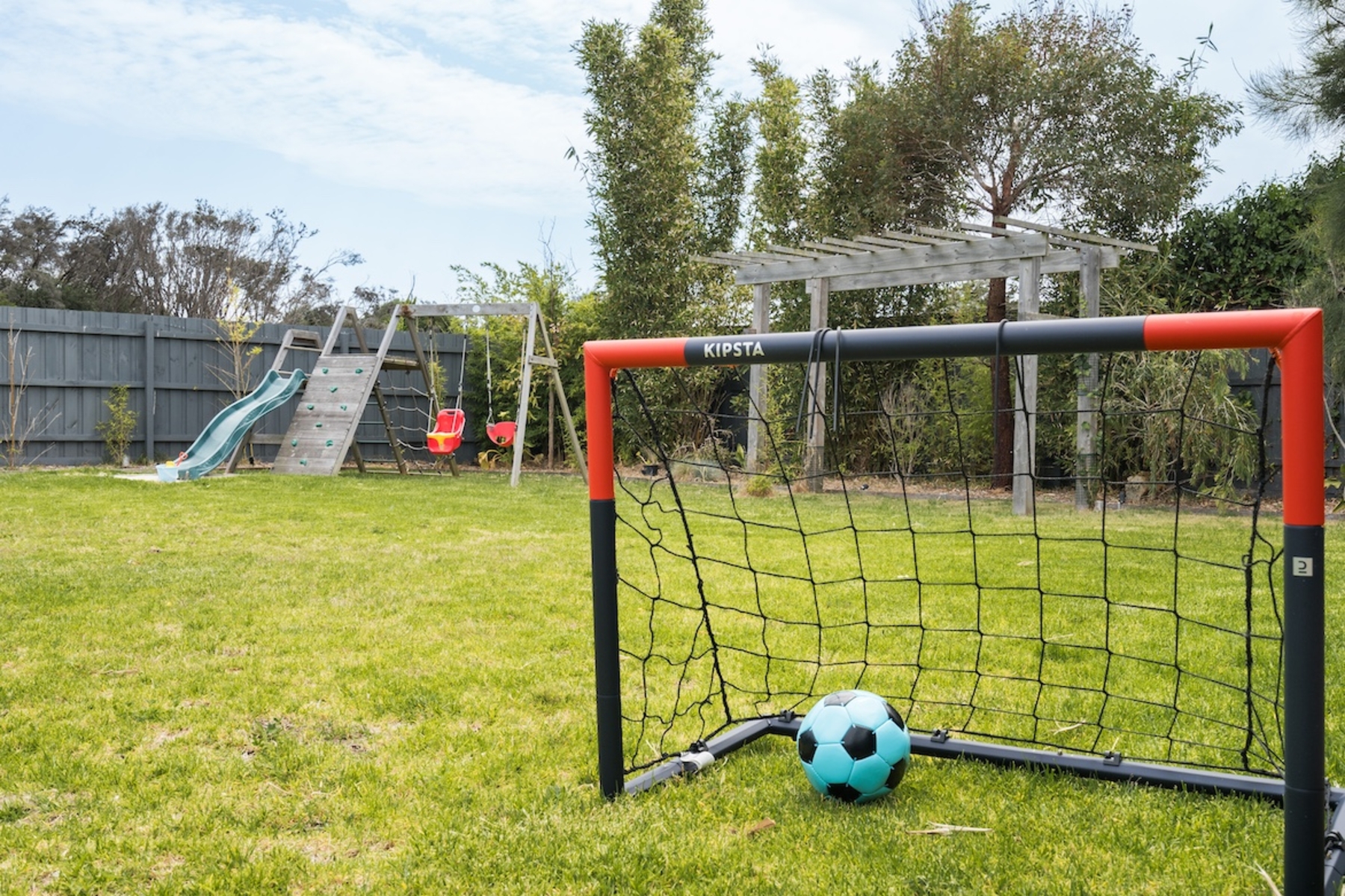 Stepping outside, we discover a private oasis – a refreshing swimming pool for warm days and an adjacent playground for the little ones to play and create memories.