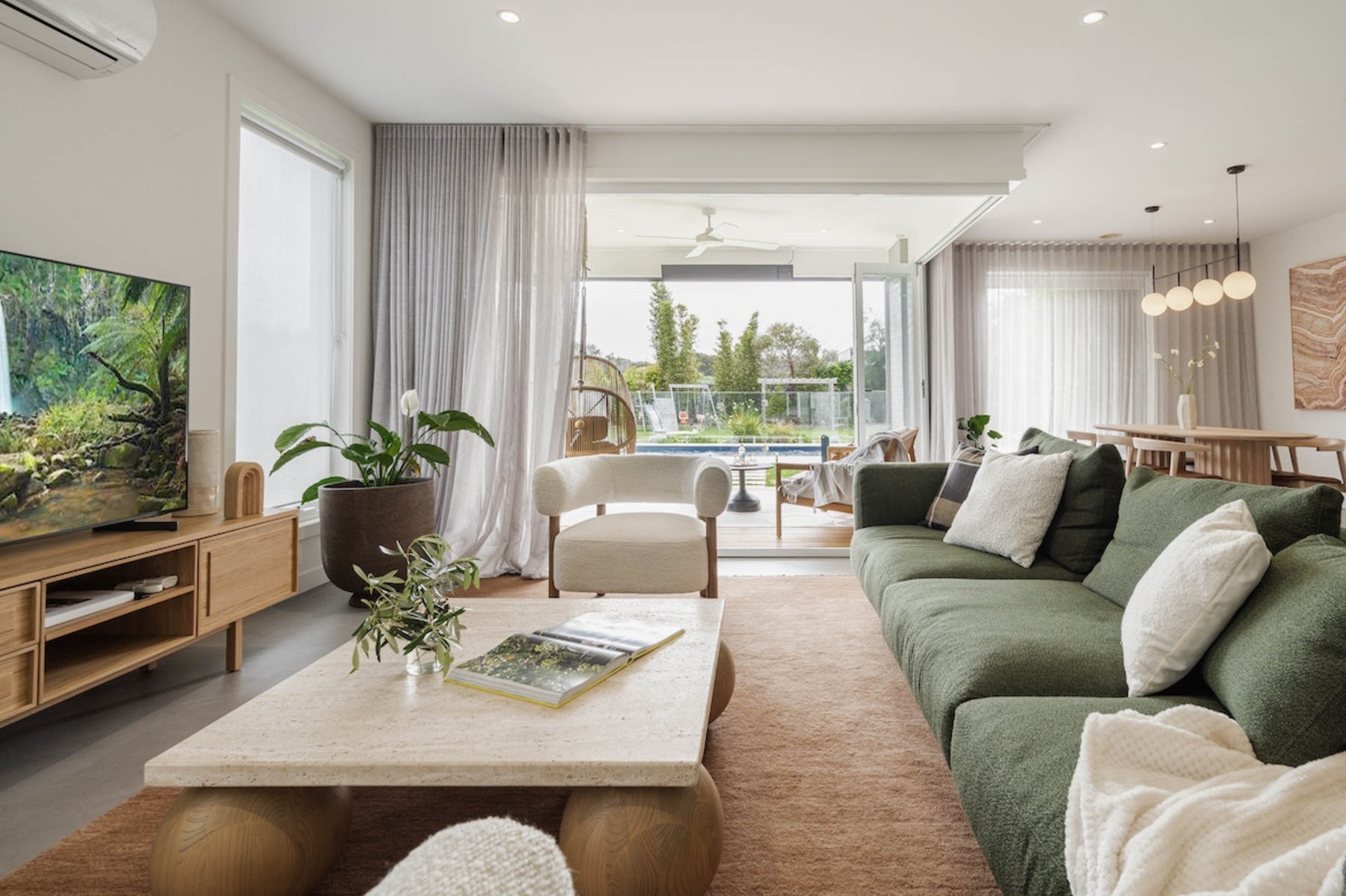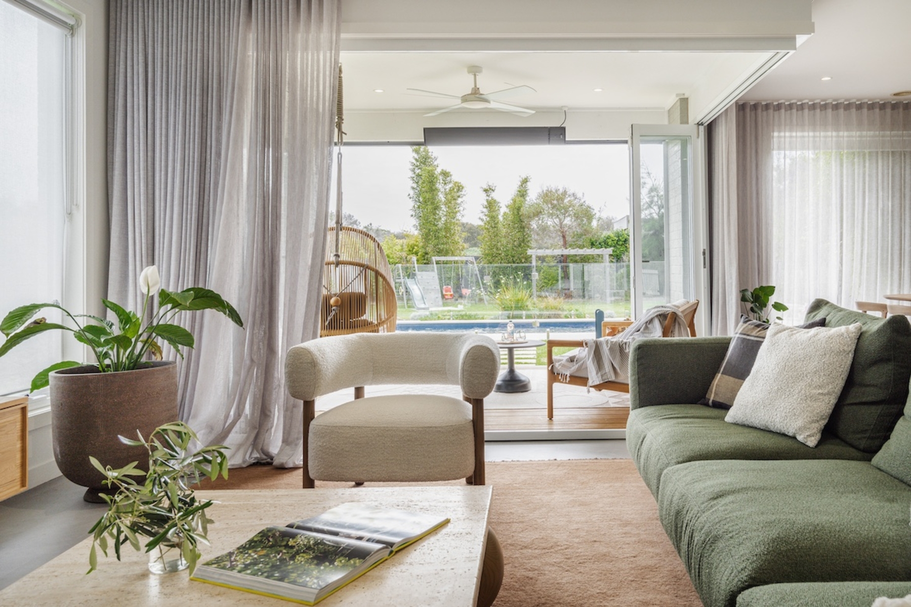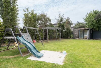 A special cabin at the end of the garden for teenagers provides a comfy retreat with a sofa and a large TV screen for movies and downtime. At night they might like a game of pool while the adults sit in the connected outdoor undercover lounge with blinds that pull down if the weather turns.