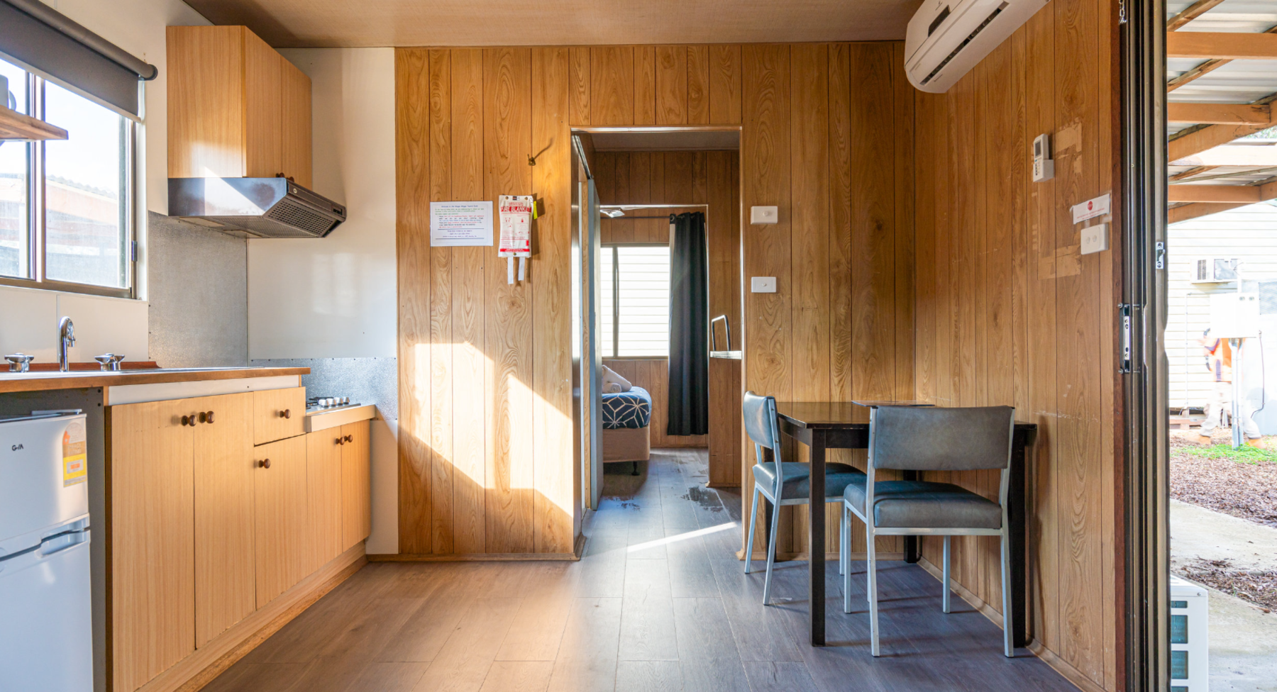 Two bedroom fully self contained cabins which sleep up to 5 persons. Each features a bedroom with a queen bed and another bedroom with a set of bunks and a single bed, an ensuite bathroom, a full kitchen with cook top,, fridge and microwave, reverse cycle air conditioner, flat screen television, dining and lounge furniture. All linen, towels and pillows are supplied free of charge.